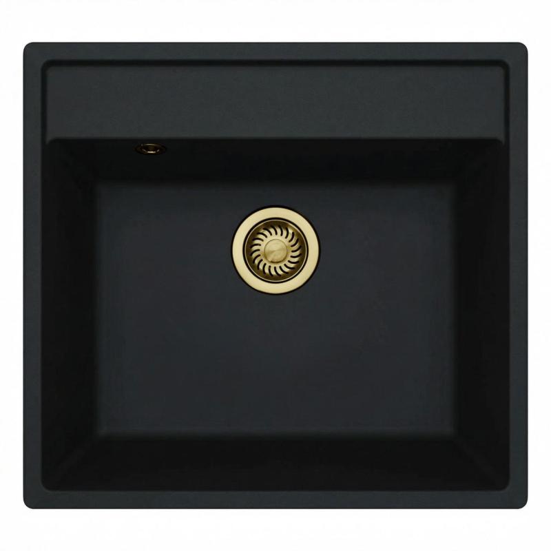 GraniteMy Bremen Évier en Granite 53x50 cm Noir – Montage en surface, Sous-comptoir et Encastré avec Trou pour Robinet et Bouchon Doré 1208969969